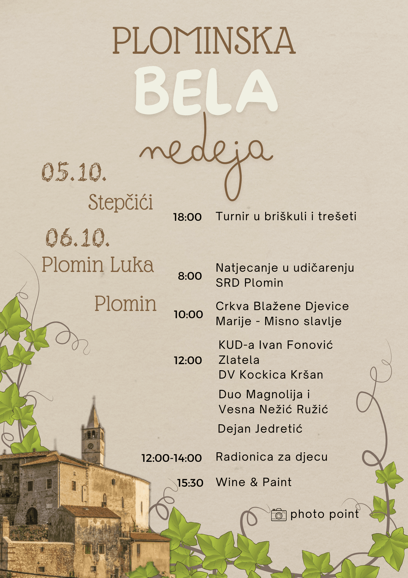 Živopisni gradić Plomin i ove će godine tradicionalno obilježiti Belu nedeju, 6. listopada, u organizaciji Turističke zajednice Općine Kršan. Osim mladog vina, kojemu je manifestacija posvećena, domaćini će ponuditi bogatu kulturnu, zabavnu i gastro ponudu.