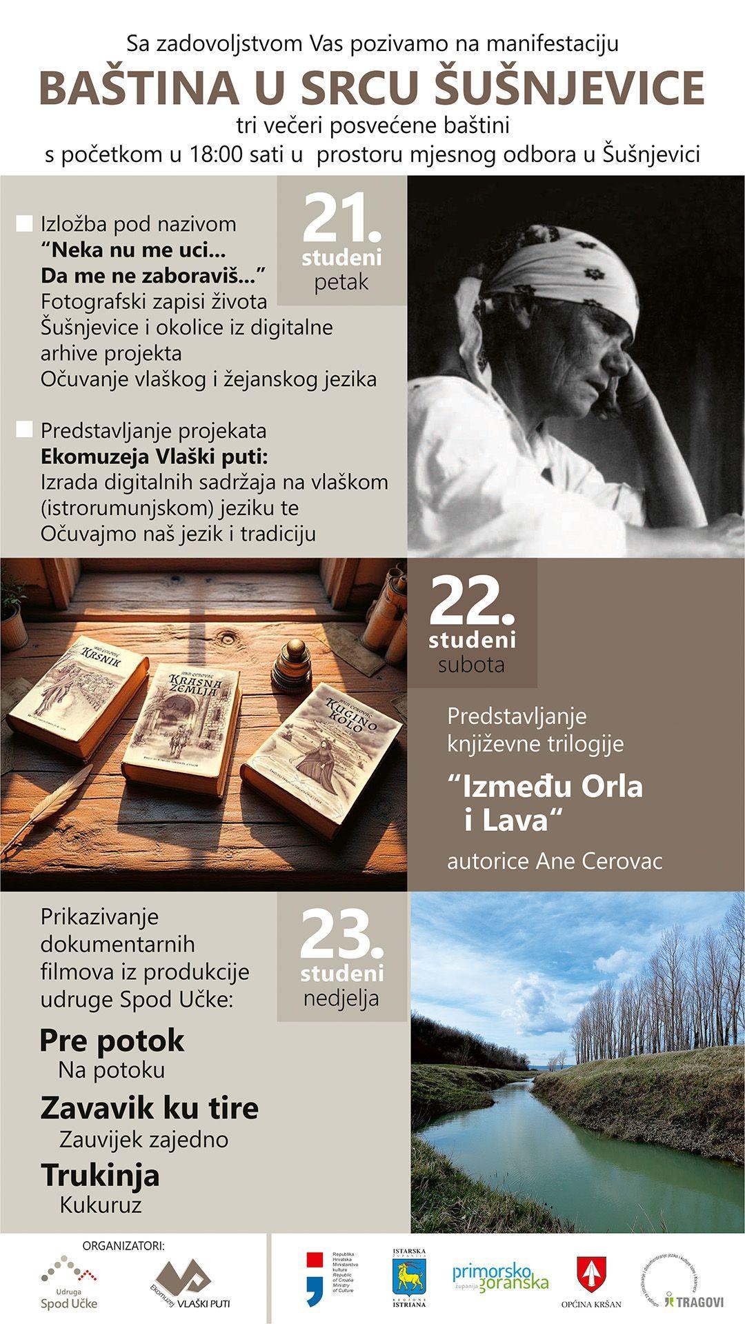 Općina Kršan poziva sve mještane i posjetitelje na manifestaciju BAŠTINA U SRCU ŠUŠNJEVICE, koja će se održati kroz tri večeri posvećene baštini, od 21. do 23. studenoga, s početkom u 18:00 sati u prostoru Mjesnog odbora u Šušnjevici.